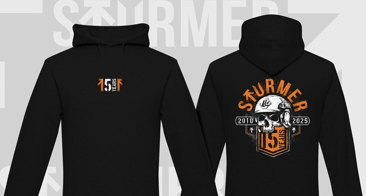 Классическая толстовка-"кенгуру" с принтом от компании Sturmer. Выпущена специально к юбилею нашей фирмы.