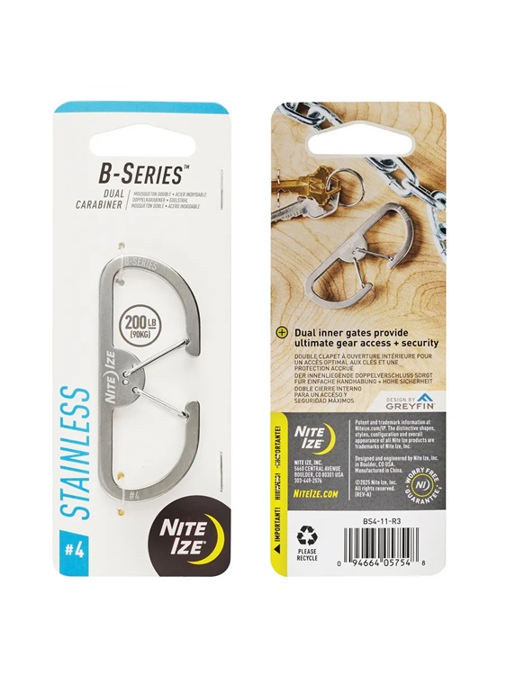 Двойной карабин, выполненный в форме буквы «B», сделан из прочной нержавеющей стали и позволяет повесить на него любой предмет весом до 90 кг. Два пружинных затвора надёжно фиксируют то, что вы повесили на карабин, и легко открываются, когда вы хотите это снять.