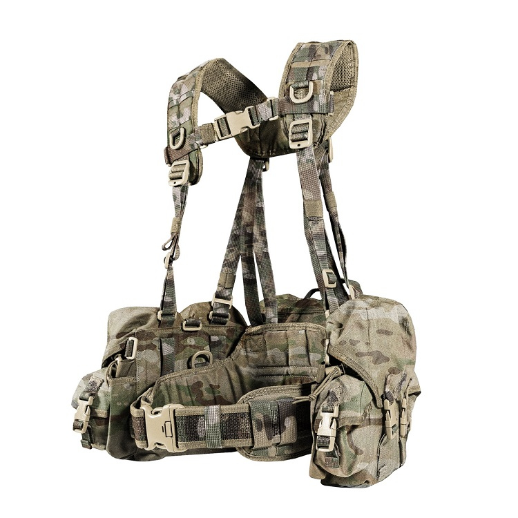 - Для защиты от потёртостей, в мягкий пояс укладывается изолоновый амортизатор толщиной 5 мм. Для равномерного распределения нагрузки между плечами и поясницей поясной ремень поддерживается в шести точках плечевыми лямками. Ременные петли лямок сначала пропускаются в D-образные кольца на магазинных сумках, малом боевом ранце (если он висит на пояснице) или мягком поясе, а затем продеваются в трёхщелевые регулировочные пряжки, свободные концы ремней заправляются под пряжки-двухщелёвки и муфты из резинки.