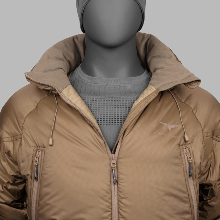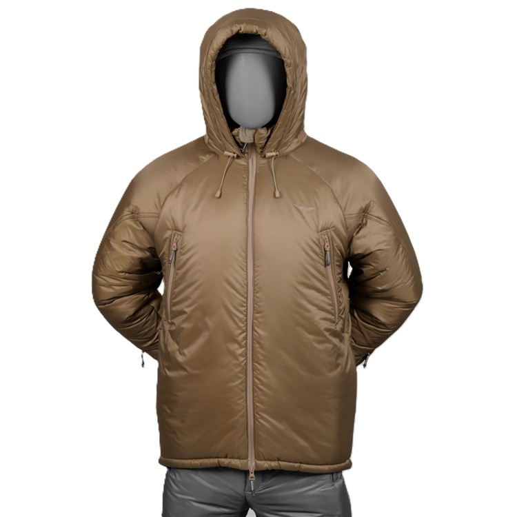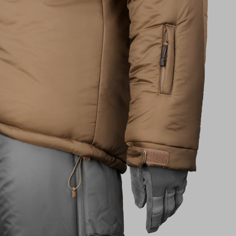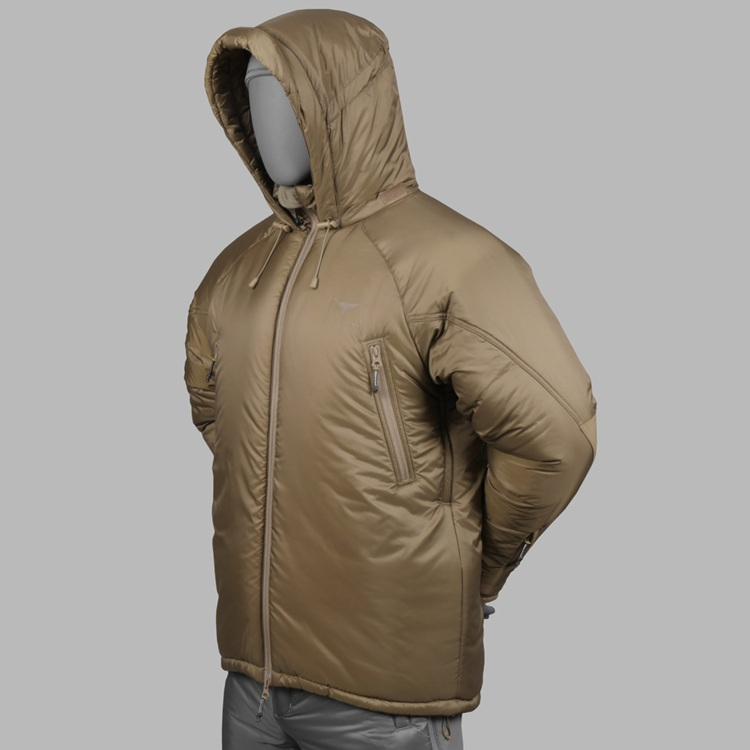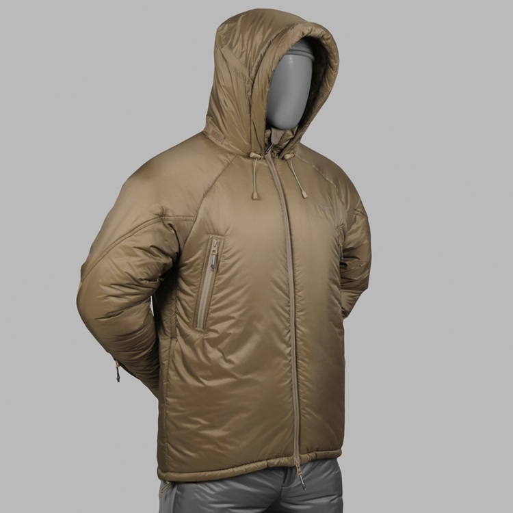 Зимняя полевая куртка седьмого слоя.Регулируемый капюшон складывается в воротник.Усиление на рукавах в области локтей.По два кармана на молниях на груди и на рукавах.На внутренней части куртки два сетчатых и два кармана на молнии.Тканевая шлёвка с пластиковым карабином в одном из сетчатых карманов.Возможность раскрытия куртки снизу за счёт двухзамковой молнии.Вентиляционные отверстия на молниях в области подмышек.Регулировка объёма по нижнему краю крутки.Регулировка манжет велкро-застёжками.Ветрозащитный клапан на внутренней части.Транспортировочный чехол в комплекте.Молнии YKK.Рассчитана на температурный диапазон от 0 до -35в зависимости от уровня активности иколичествасостава внутренних слоёв одежды.Состав:Внешняя ткань 100% нейлон с ик-ремиссией.Утеплитеть Dupont Thermolite 280 г/м² (плотность в контуре капюшона и воротника 140 г/м²).Коэффициент теплоизоляции 5.4 CLO.Вес куртки от 1,1 до 1,250 кг. в зависимости от размера.Габариты в транспортировочном состоянии: цилиндрический чехол высотой 30см., и диаметром 23см.