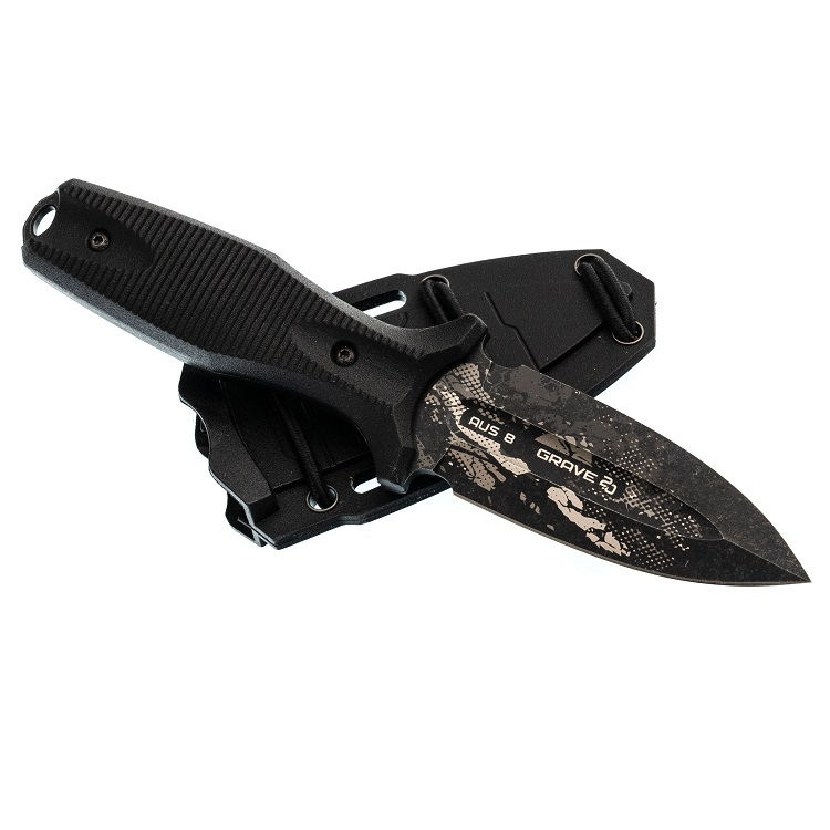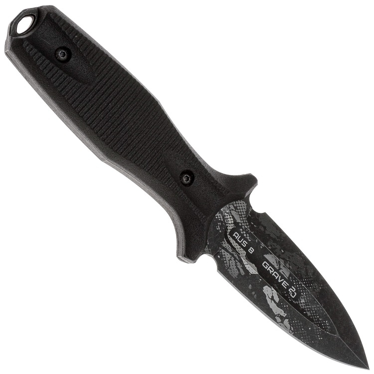 Рукоять Grave 2.0 изготовлена из эластрона, материала, обеспечивающего превосходный захват и комфортное использование. Это дополняется ножнами из литого пластика, обеспечивающими надежную фиксацию и долговечность. Благодаря горячей формовке, ножны из литого пластика плотно охватывают нож, предотвращая его случайное выпадение и обеспечивая безопасность при ношении. Ударное навершие ножа Grave 2.0 может быть использовано как стеклобой, что делает его незаменимым инструментом в чрезвычайных ситуациях.