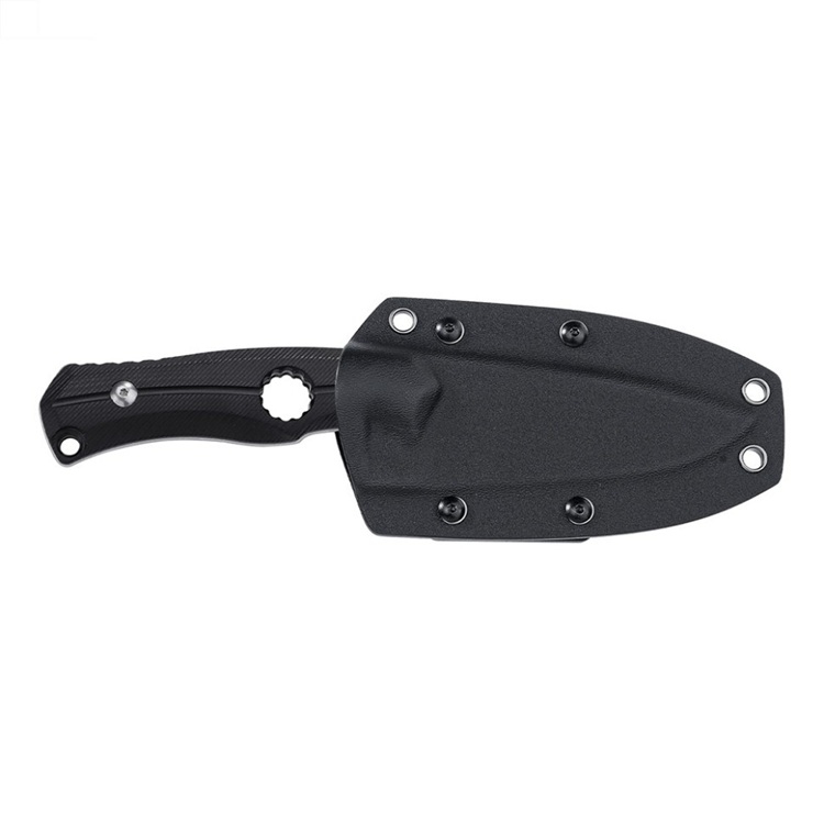 Рукоять изготовлена из прочного и износостойкого композитного материала G10, устойчивого к влаге, ударам и агрессивной среде. Благодаря эргономичной форме и текстурированной поверхности нож надежно лежит в руке, обеспечивая уверенный хват даже в мокрых условиях. В рукояти предусмотрено отверстие, которое снижает общий вес конструкции. Также есть дополнительное отверстие для темляка.