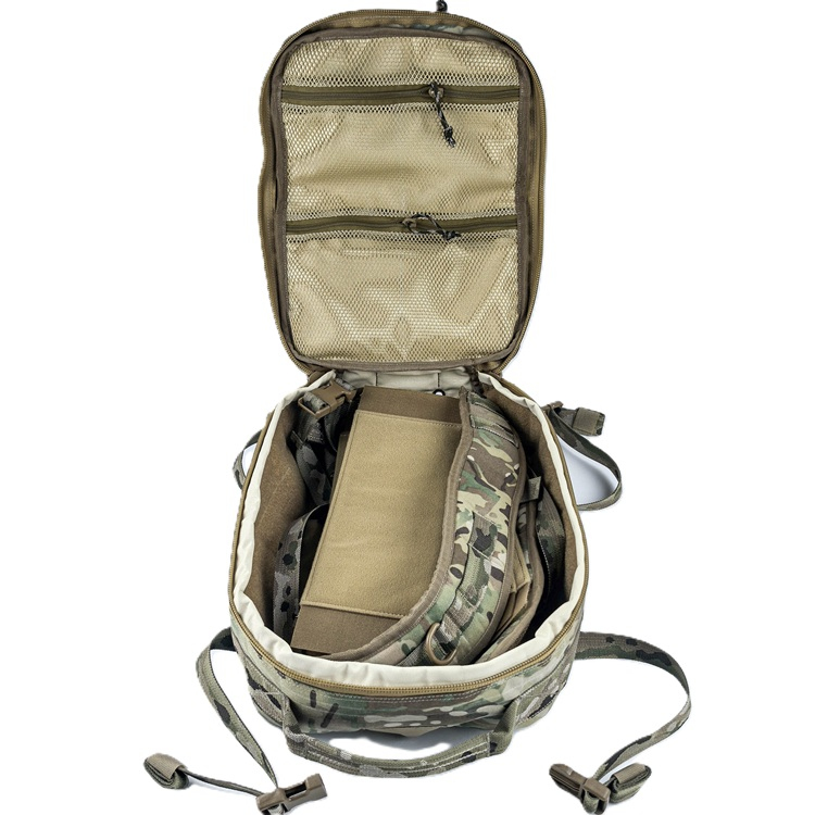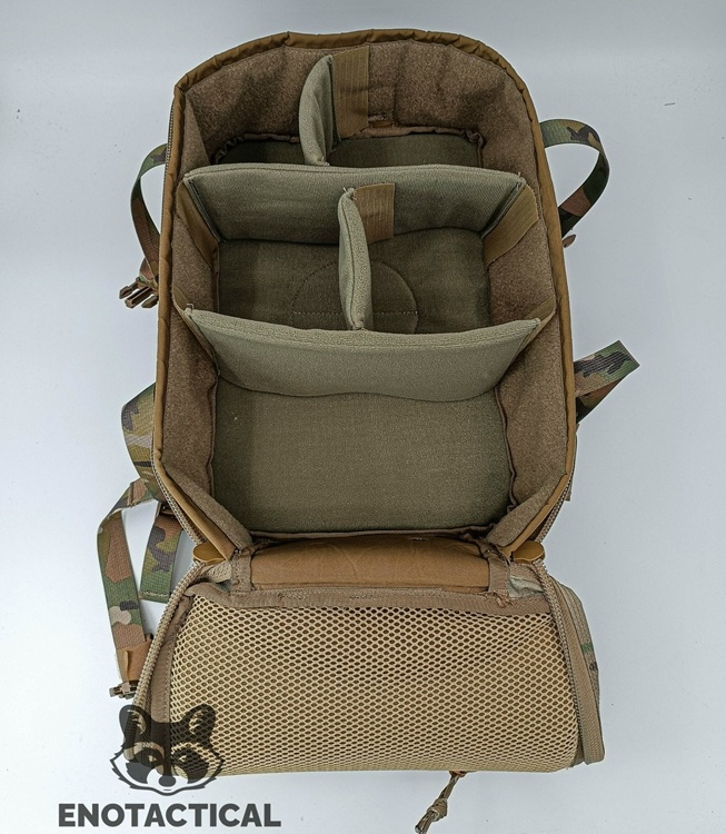 Верхний карман (меньшего объема) открывается полностью, внутри нашиты карманы для организации мелких вещей и снаряжения