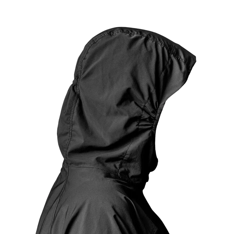 Эластичная окантовка по низу куртки, на манжетах эффективно защищает от ветра. Капюшон подрезинен по бокам овала лица и на затылке. Ветровка имеет два боковых кармана и один нагрудный на молниях.